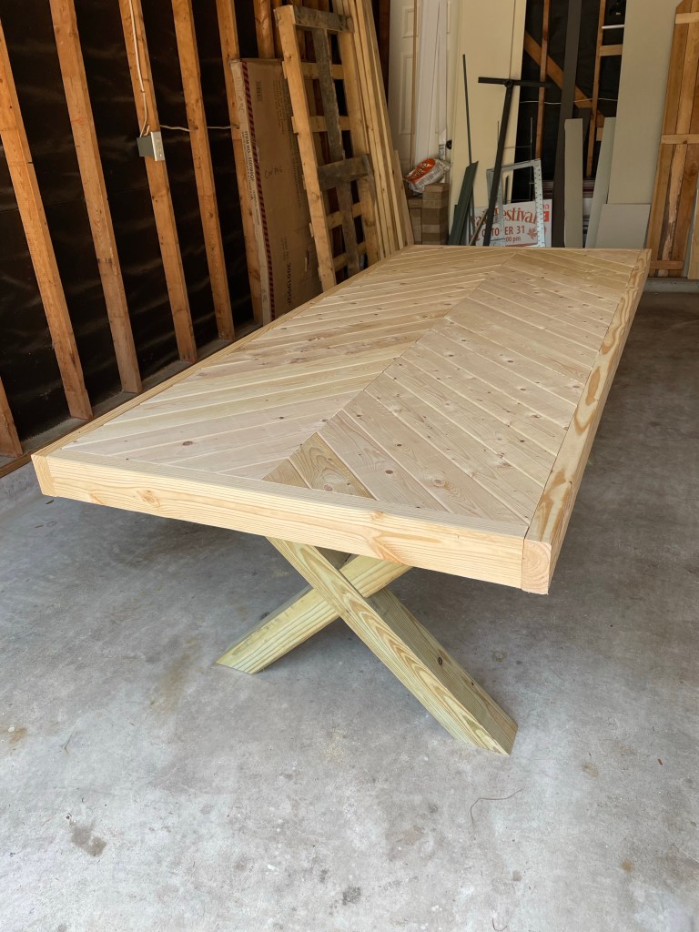 When asked if I know how to cook, I typically respond with, “Well, I know how to follow directions.” As I dove headfirst into into the task, I found the project closely reflected this sentiment. Perhaps I’m oversimplifying since one does, after all, require specific, sometimes pricey tools for the job and needs to take the time to figure them out, but well-laid plans, which she provided, make a world of difference. So, after a couple of weeks of hot and sweaty effort in the makeshift workshop that was our garage, I proudly presented to my wife the (unstained) herringbone-patterned table and promised her a couple of modified benches to match in the weeks to come.