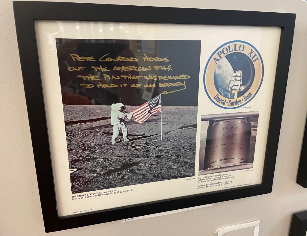 One of several autographed prints by Bean on display at the Freeman Library. This one, a photo he snapped himself, reads: “Pete Conrad holds out the American flag. The pin that was designed to hold it out was broken.”