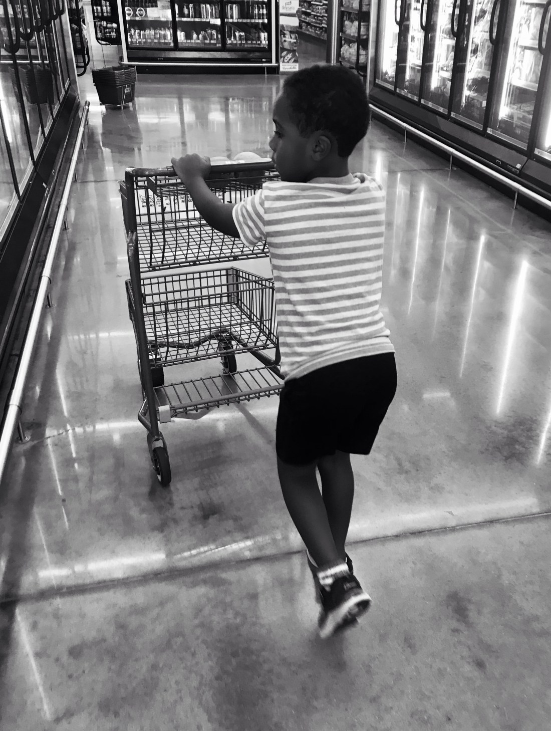 After parking, I decide to encourage good habits and recruit him as a helper. He enthusiastically grabs a small cart and follows me carefully around for the few things we need. Checking out, he places our items on the belt, pushes the cart outside, helps me load our purchases into the van, and even eases the cart to the designated spot in the parking lot. I’m pleased to observe he does it all eagerly and without complaint.